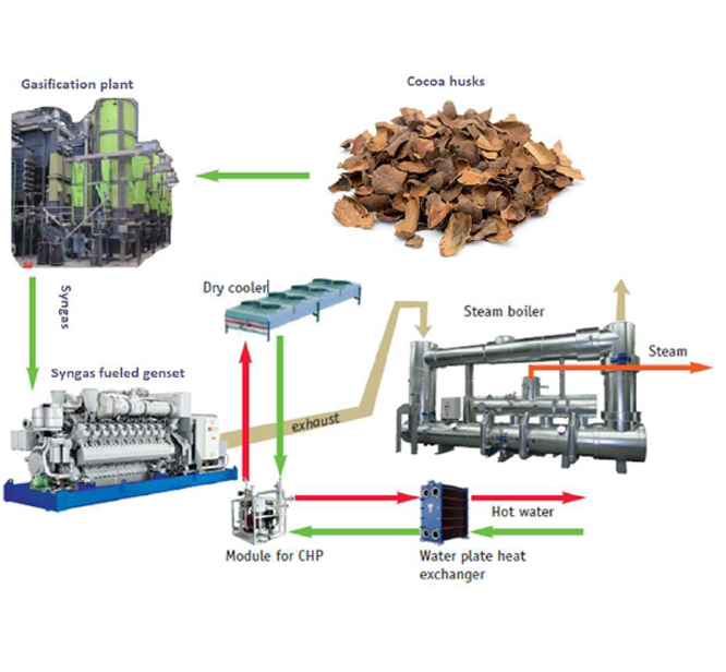 At its Tema site, Cocoa Processing Company, requires a highly efficient power system consisting of biomass gasification and a combined heat and power (CHP) generation package using cocoa shells and pod husks as biomass fuel feed stock for optimum efficiency under a Captive Model.